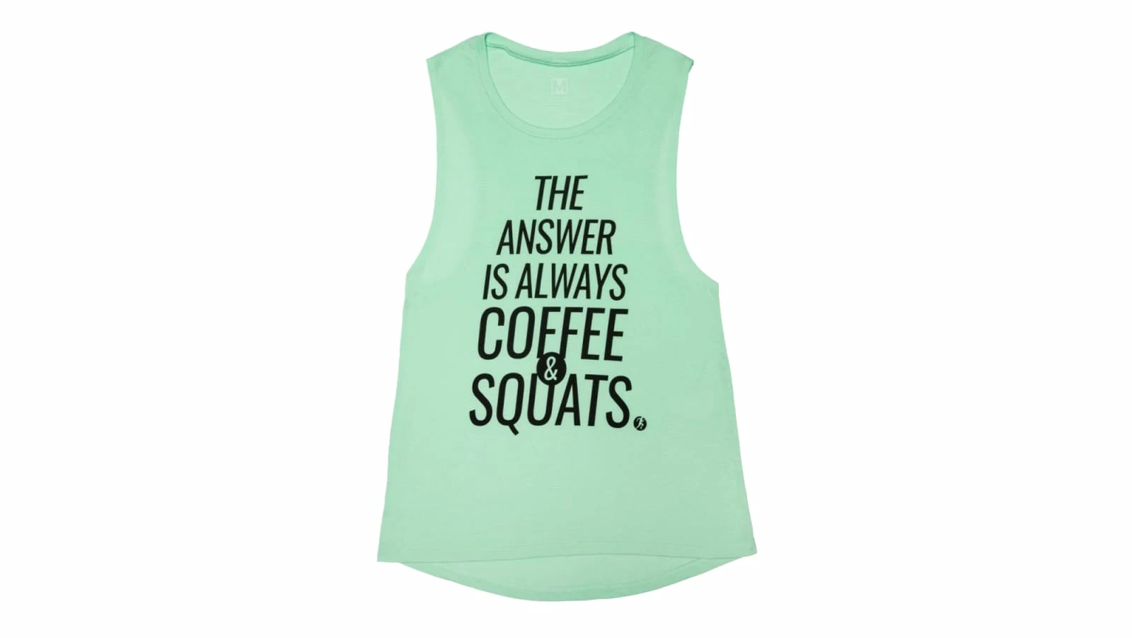 This comfortable women’s muscle tank from Compete Every Day is made from a polyester-viscose blend fabric, and features the official slogan of the energized A.M. gymrat: “The Answer is Always Coffee & Squats.” Available here in mint green.