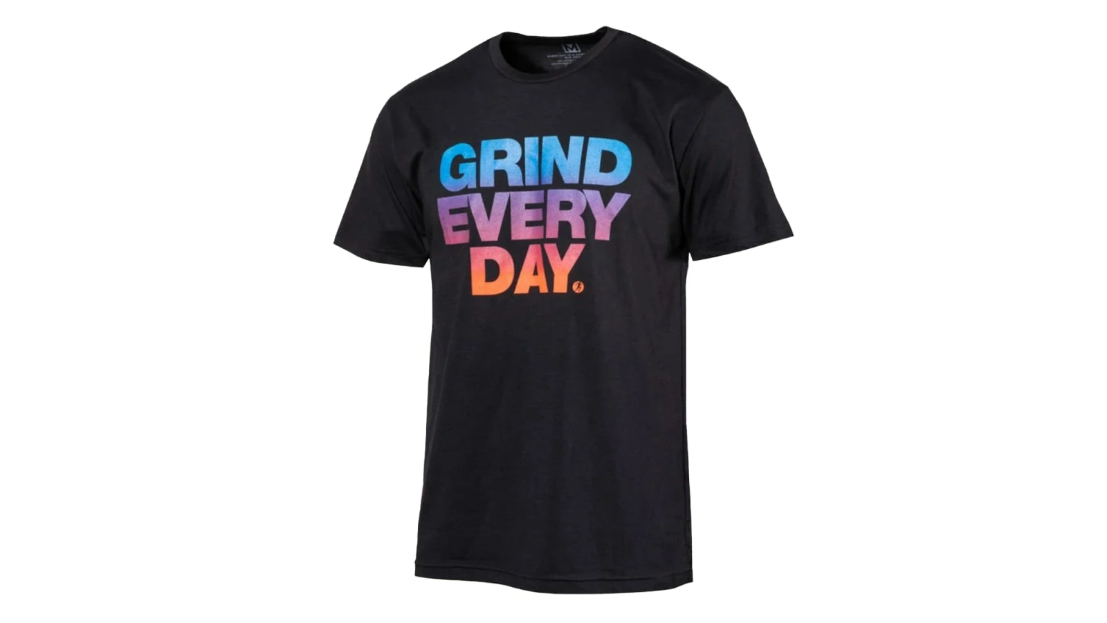 The “Grind Every Day” men’s tee is available here in Black with the shirt’s motivational slogan printed across the chest. Made from a flexible cotton-poly blend material, this design offers a free range of motion in the gym and optimal comfort as casual wear.