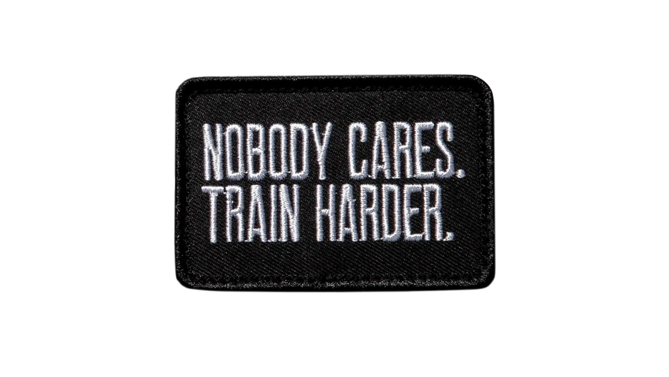 This 3×2” motivational patch features the official mantra of CrossFit Linchpin  slogan “Nobody Cares. Train Harder.” with white stitching on a black background.