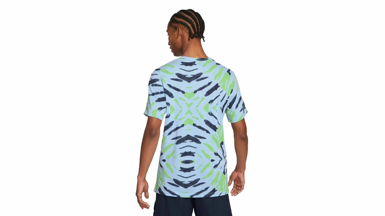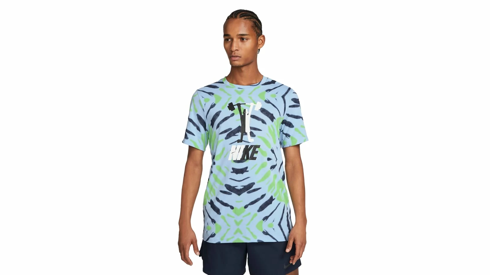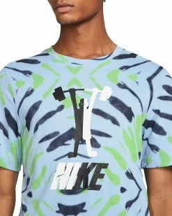 The colorful “Festival” Men’s Training Tee from Nike features a weightlifter silhouette design on the front, printed on a “Psychic Blue” graphic print.