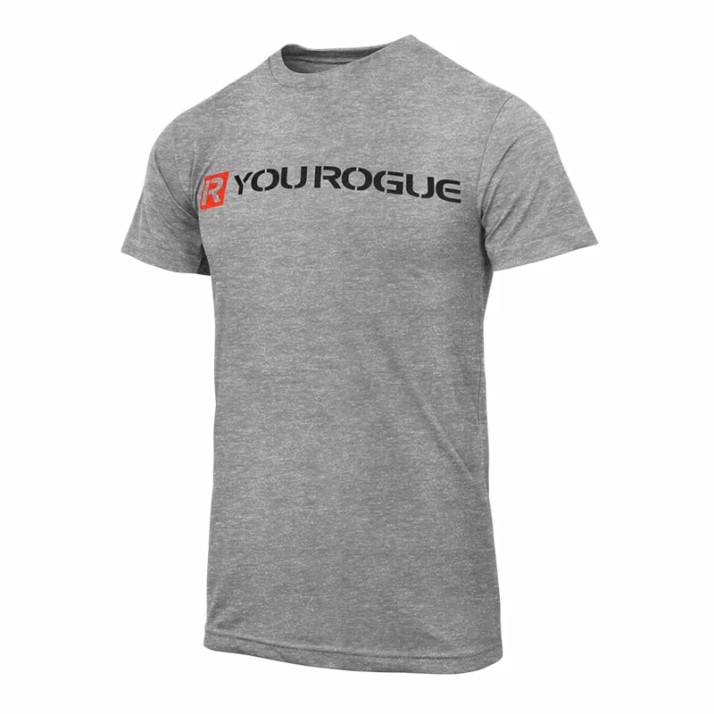 The “R You Rogue” Flag Shirt, available here in Gray, features a red #RYouRogue slogan on both sides, and a vertical U.S. flag in charcoal grey on the back.