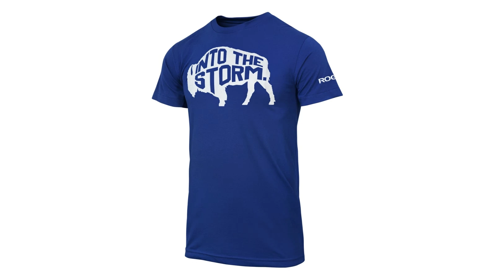Available here in Lapis Blue with white print, this cotton-poly, athletic-cut tee features the “Into the Storm” slogan across the front, stylized inside a roaming buffalo silhouette. A Froning *R logo is printed on the upper back, along with a Rogue logo on the left sleeve.