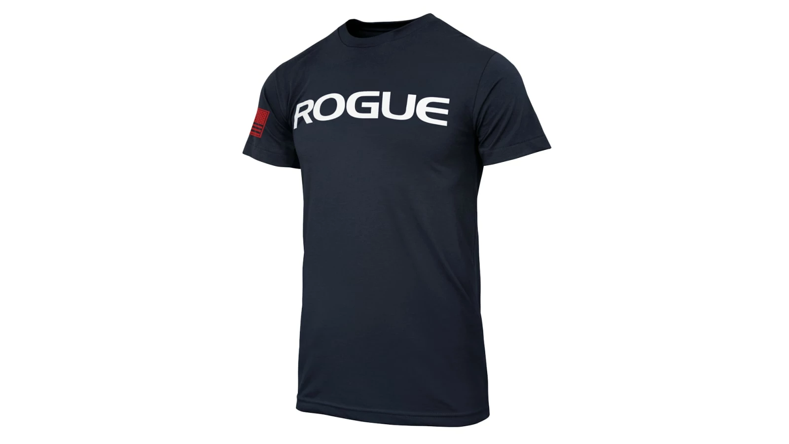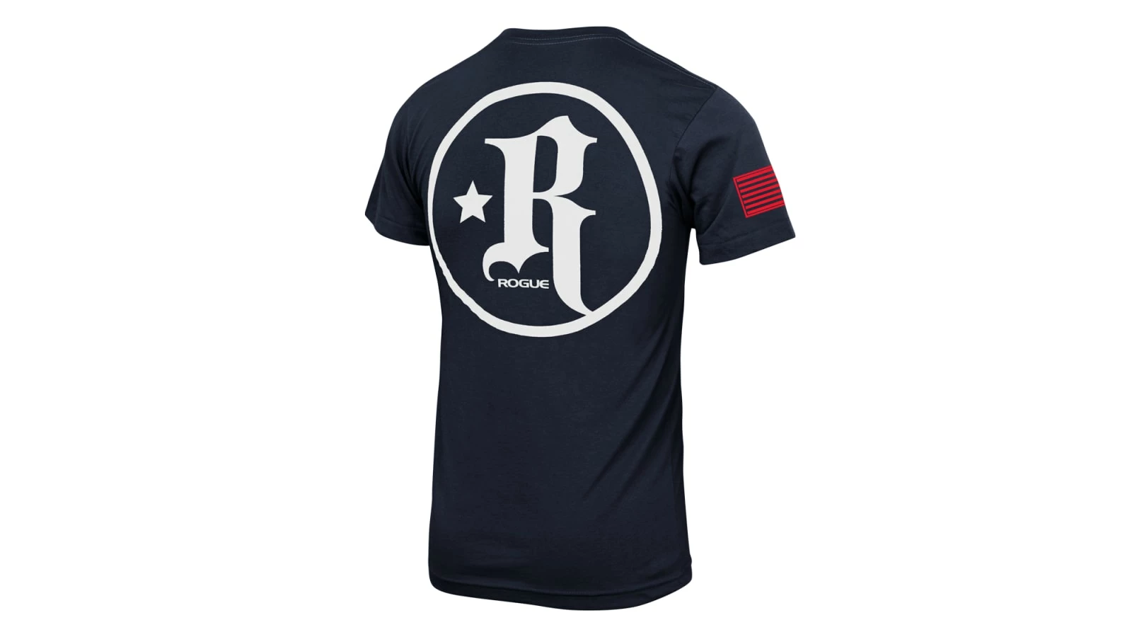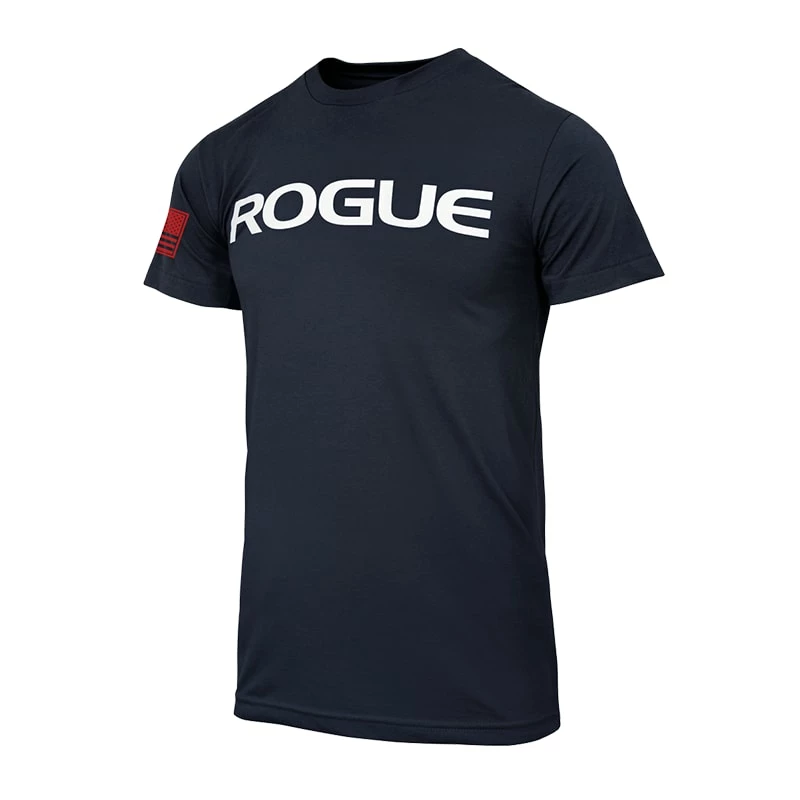Available here in Navy, this cotton-poly, athletic-cut shirt features the Rogue logo across the chest in white and a red military-style flag design on the right sleeve. A large Froning *R logo, in white, is printed on the back.
