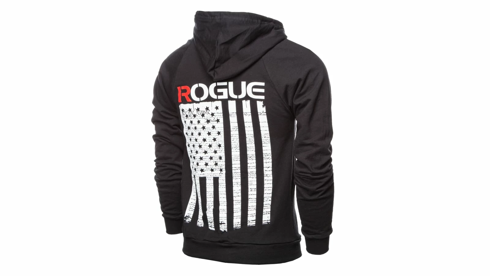 The Rogue American Hoodie is a streamlined and slim-cut fleece zip-up featuring the Rogue “R” in red on the front and a large, military-style USA flag in black-and-white on the back.