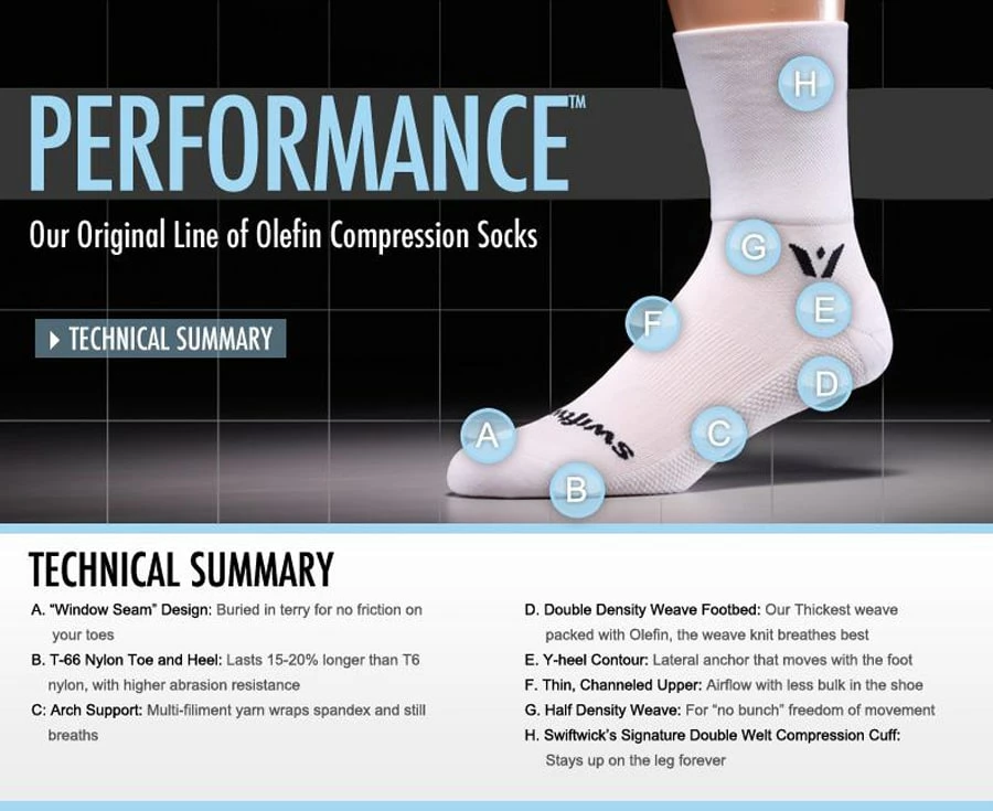 To deliver top Performance we use Olefin fibers to produce a fast drying, lightweight sock with superb abrasion resistance and long-lasting durability. As a fiber, Olefin retains less than .01% of its weight in moisture and resists deterioration from chemicals and perspiration. The combination of nylon and spandex with the Olefin antimicrobial fiber helps create a softer, more comfortable sock with incredible breath-ability for everyday wear.