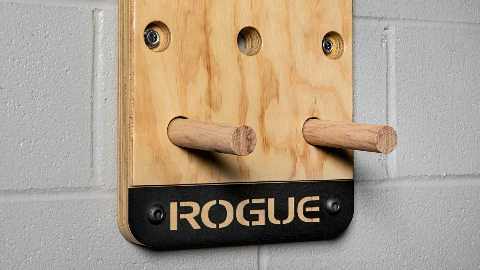The official, wall-mounted Rogue Peg Board is made in the USA from your choice of top-quality maple or pine. Each set includes one 1.5″ thick board (89.75” tall x 11.75” wide) and two grip-friendly wood dowel rods—each measuring 6.5” in length and 1.19” in diameter.