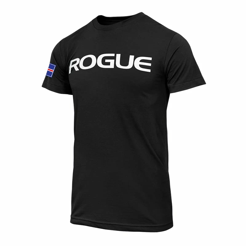 The athletic-fit black tee features the Rogue logo in white on the front, with the flag of Iceland on the right sleeve and the word “THOR” printed on the back.