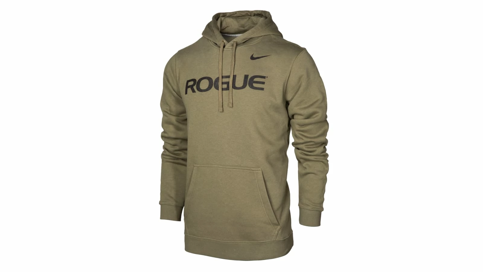 This Rogue exclusive version of the Nike Club Fleece Hoodie combines classic style with extra-soft comfort. The standard-fit men’s fleece pullover is available here in olive green with the Rogue logo across the chest in black, and features a ribbed hem and cuffs, traditional kangaroo pocket, and adjustable drawstring hood.