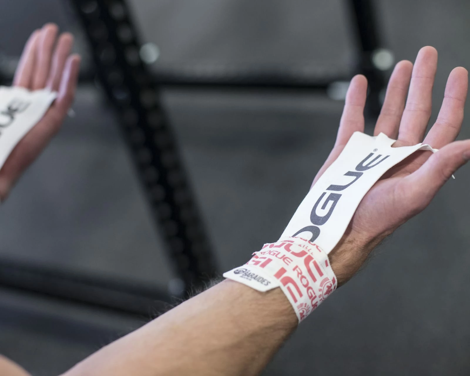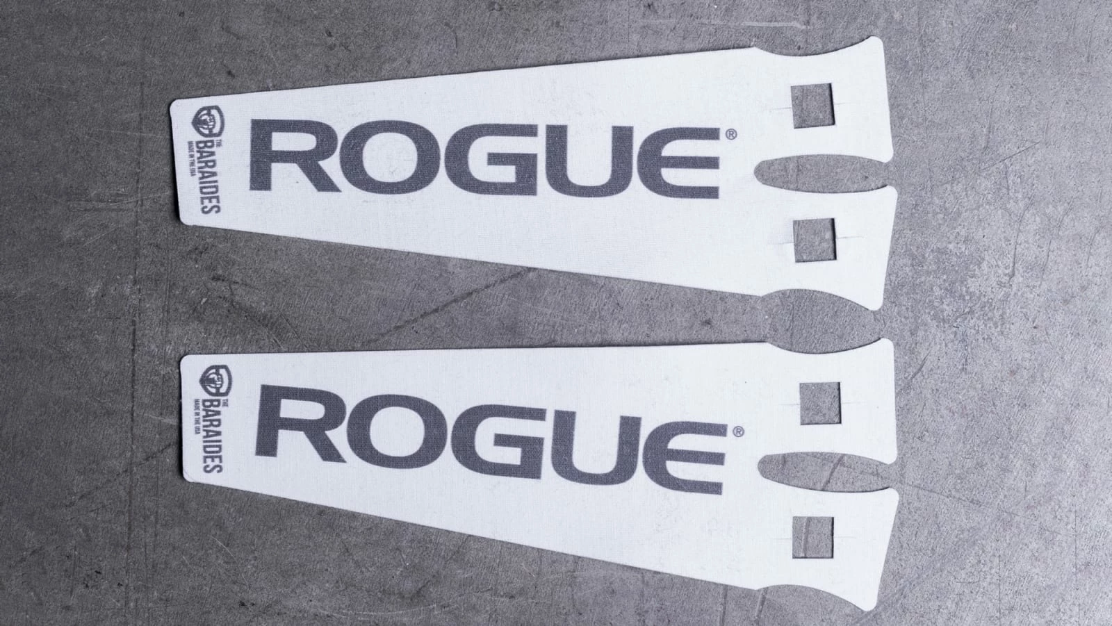 Rogue BarAides are durable, Military-grade hand grips developed specifically for high-intensity workouts, protecting against tears and abrasions. This RX brand of BarAides, available here in white with the Rogue logo in black, includes expandable finger holes (“one size fits most”) and a proprietary polymer core.